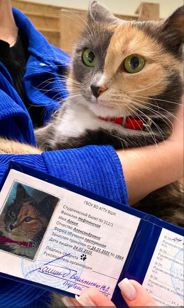 В Алметьевске (Татарстан) кошка Агния Нефтянская официально стала студенткой Высшей школы нефти и получила студенческий билет вуза. Об этом сообщает тг-канал учебного заведения.