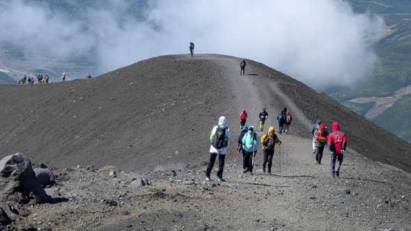 Массовое восхождение на Авачинскую сопку на Камчатке было приурочено ко «Дню вулкана». Вершину покорили около 1 тысячи человек.