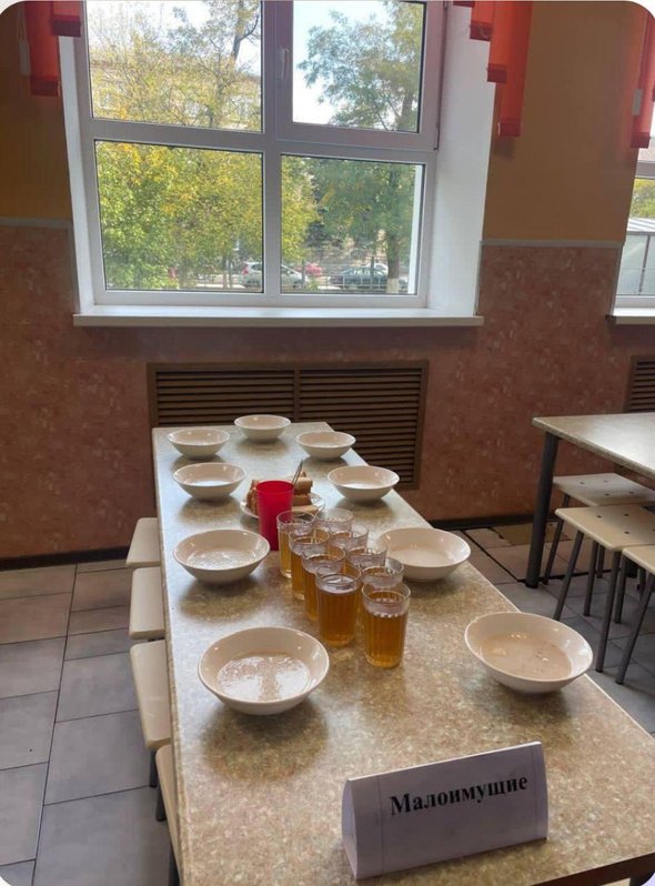 В школьных столовых Азова поставили таблички, разделяющие «малоимущих» и «детей участников СВО». Блюда на столах для них тоже разные
