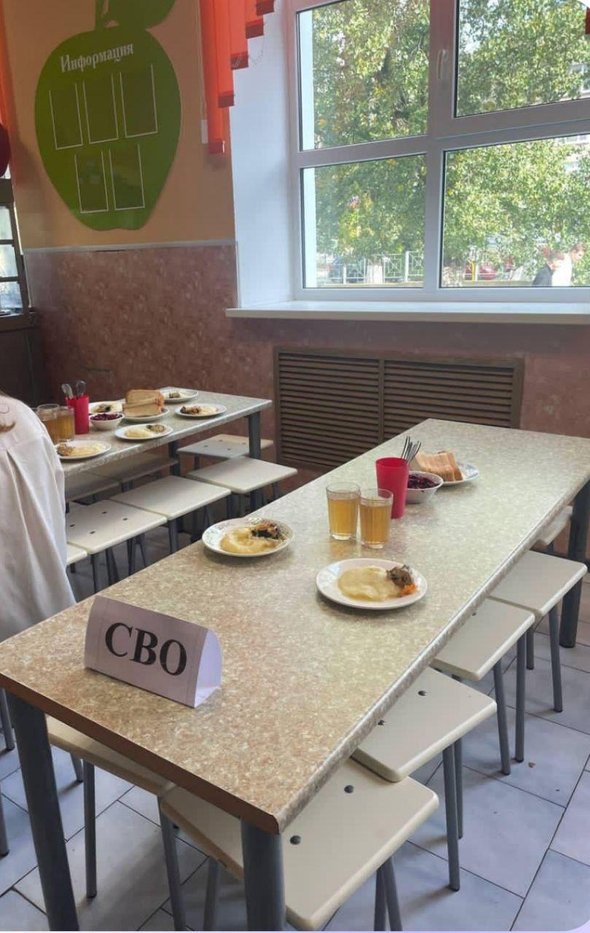 В то же время на столе, где стояла табличка «СВО», был сервирован свекольный салат, хлеб, чай и тарелки с пюре, мясом и овощами.