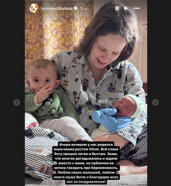 «Вчера вечером у нас родился мальчишка ростом 50 см. Все прошло легко и быстро. Знаю, что многие догадывались и ждали вместе с нами, но публично не хотела говорить про беременность. Люблю своих малышей, люблю моего мужа Витю и благодарю всех за поздравления», — написала певица.