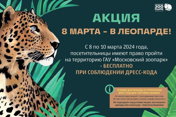 Женщины в одежде с леопардовым принтом смогут бесплатно попасть в Московский зоопарк с 8 по 10 марта. Об этом сообщает тг-канал зоопарка.