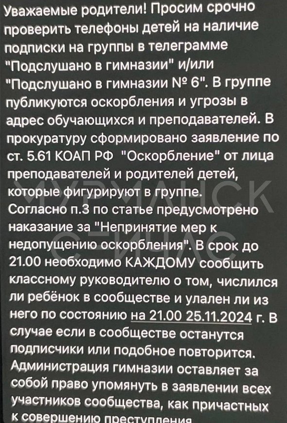 В местных телеграм-каналах также распространилось сообщение, которое якобы адресовано родителям школьников. Их попросили проверить наличие у детей подписки на паблик «Подслушано в гимназии».