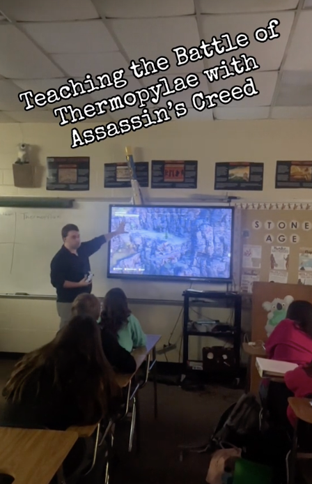 Видео, как школьный учитель объясняет тему, играя в Assassin's Creed, стало вирусным в тиктоке. По мнению преподавателя, в видеоигре множество отсылок к знаковым историческим событиям, что позволяет использовать ее в учебных целях. Например, с помощью игры преподаватель объясняет историю Древней Греции.