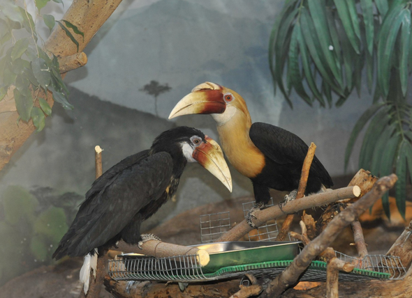 В зоопарке рассказали, что птенец папуанского калао родился в ноябре 2024 года, но на публике он стал появляться только весной 2025 года, так как до этого оставался с мамой закрытом гнезде.