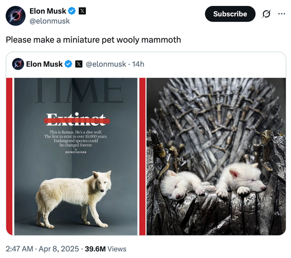 Илон Маск узнал, что биотехнологи воссоздали вымерших лютоволков, и попросил ученых вырастить «пушистого мамонтенка»