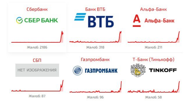 Жалобы приходят о сбоях в работе крупных банков, включая Сбер, ВТБ, Т‑Банк, Альфа-Банк и OZON Банк, а также нарушениях работы Системы быстрых платежей (СБП). Данные о проблемах фиксируются на платформе Downdetector — специализированном сервисе мониторинга сбоев интернет‑ресурсов и приложений.