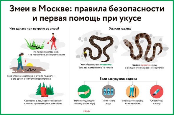 «На природных территориях Москвы просыпаются змеи… Гадюка — ядовитая змея, которая способна нанести укус на уровне не выше колена взрослого человека. В связи с этим специалисты рекомендуют для прогулок на природе надевать высокую обувь либо брюки из плотной ткани, которую не сможет прокусить змея.