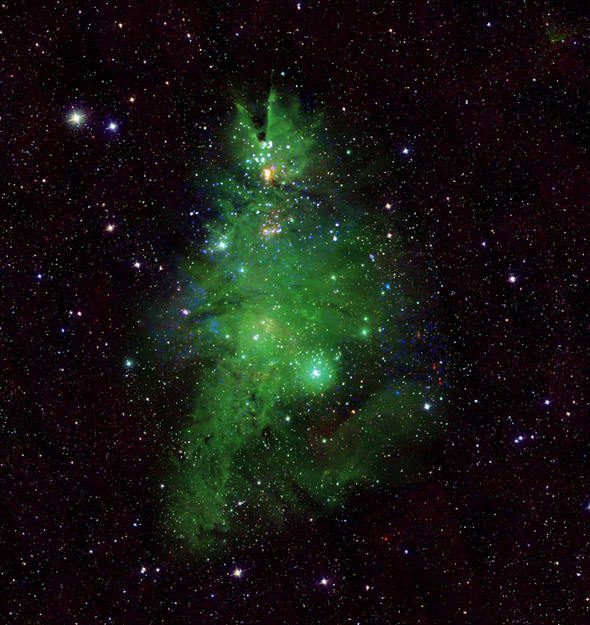 Ученые совместили все полученные телескопами снимки, повернули их особенным образом и увидели вполне реальное сходство созвездия с рождественской елкой. Так, например, синие и белые огни, напоминающие пучки гирлянд на снимке — это молодые звезды, излучающие рентгеновские лучи, зеленая область, напоминающая хвою — газовая туманность.