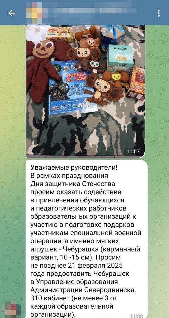 Со слов одной из воспитательниц, директор детсада в Северодвинске, где работает женщина, прислала в чат коллектива сообщение о сборе подарков военным в честь 23 февраля. Поручение пришло из городского управления образования, которое попросило предоставить от каждой образовательной организации не меньше трех игрушечных чебурашек.