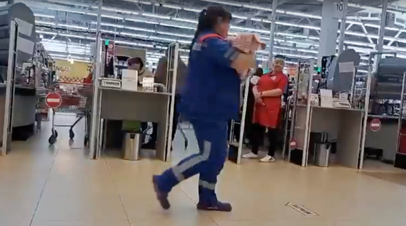 Следом за медбратьями идет фельдшер, которая несет сверток из одеяла. Одна из кассирш кричит ей, «ну кто хоть родился», сотрудница скорой отвечает, что это мальчик.