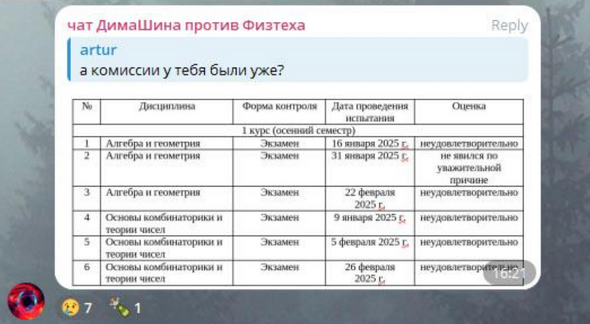 Сейчас стало известно, что Дмитрий отчислили из МФТИ уже во второй раз и опять практически сразу после первой сессии. Судя по сообщениям в канале, бывший студент не сдал алгебру и геометрию, а также получил неуд по «Основам комбинаторики и теории чисел». Позже он сам подтвердил, что больше не учится на физтехе.