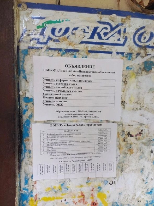 Жителей Казани возмутили бумажные объявления на подъездах с вакансиями для учителей в одном из лицеев города. Раскритиковавшие подобный способ поиска сотрудников казанцы посчитали его несолидным и удивились, что в учебное заведение требуются преподаватели практически по всем предметам. Об этом сообщает tatarstan24.tv.