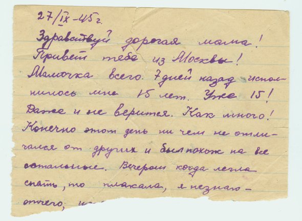 «Здравствуй, дорогая мама! Привет тебе из Москвы! Мамочка всего 7 дней назад исполнилось мне 15 лет. Уже 15! Даже и не верится. Как много! Конечно этот день ни чем не отличался от других и был похож на все остальные. Вечером когда легла спать, то плакала, я незнаю — отчего, … (дальше лист обрывается; письмо продолжается на оборотной стороне)… он наконец настанет! Мама, какая ты теперь стала, старенькая наверное. я не представляю себе тебя. Уже забыла. Я ведь тогда была маленькая — всего 7 лет было, а теперь 15 лет. Я уже не представляю, как это жить с мамой».