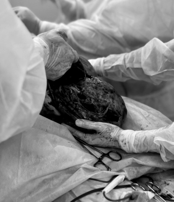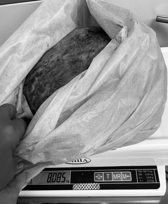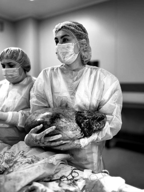Ситуацию осложнял гидронефроз правой почки, как следствие того, что органы были сильно сдавлены. Была выполнена лапаротомия. Образование весом 8 кг было удалили в полном объеме.