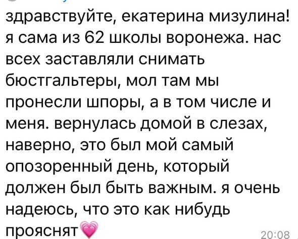 «В мою аудиторию зашли три девушки без лифчиков. Одну девушку не пропускали в корсете. Других просили снять косточки. Девушку с брекетами допустили только через час. <…> Лифчики снимали не в туалете. Был заход в школу, и там стояла рамка. Кто пищал, их выводили, на улице их проверяли, потом они проходили и опять пищали, и им говорили: „Снимайте лифчик“. Кто-то говорил: „Показывайте“. Кому-то проверяли просто шорты. Некоторые снимали в коридоре, некоторые выходили на улицу. Папа одной моей одноклассницы насчитал только на улице 11 девочек, которые выходили снимать лифчики. А сколько их было внутри, неизвестно», — рассказала одна из девочек.