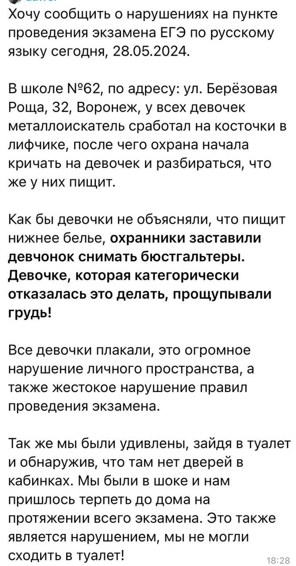 «Стояли на улице, плакали и снимали лифчики»: воронежские школьницы рассказали, что перед ЕГЭ их заставили снимать белье