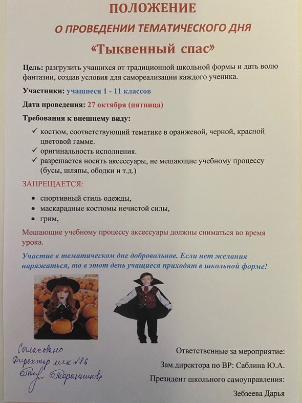 Впервые в нашей школе в пятницу 27 октября пройдет тематический день под названием «Тыквенный спас». Все желающие смогут прийти в школу в костюмах, согласно положения. На переменах вас ждут увлекательные конкурсы и мастер-классы. Будет работать фотозона.