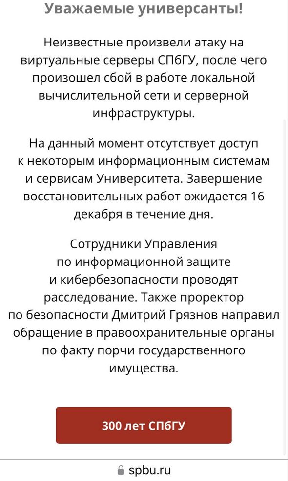 Санкт-Петербургский государственный университет заявил о хакерской атаке на серверы вуз, из-за произошел сбой в работе локальной вычислительной сети и серверной инфраструктуры. Такое объявление появилось на сайте вуза, который также не работает.