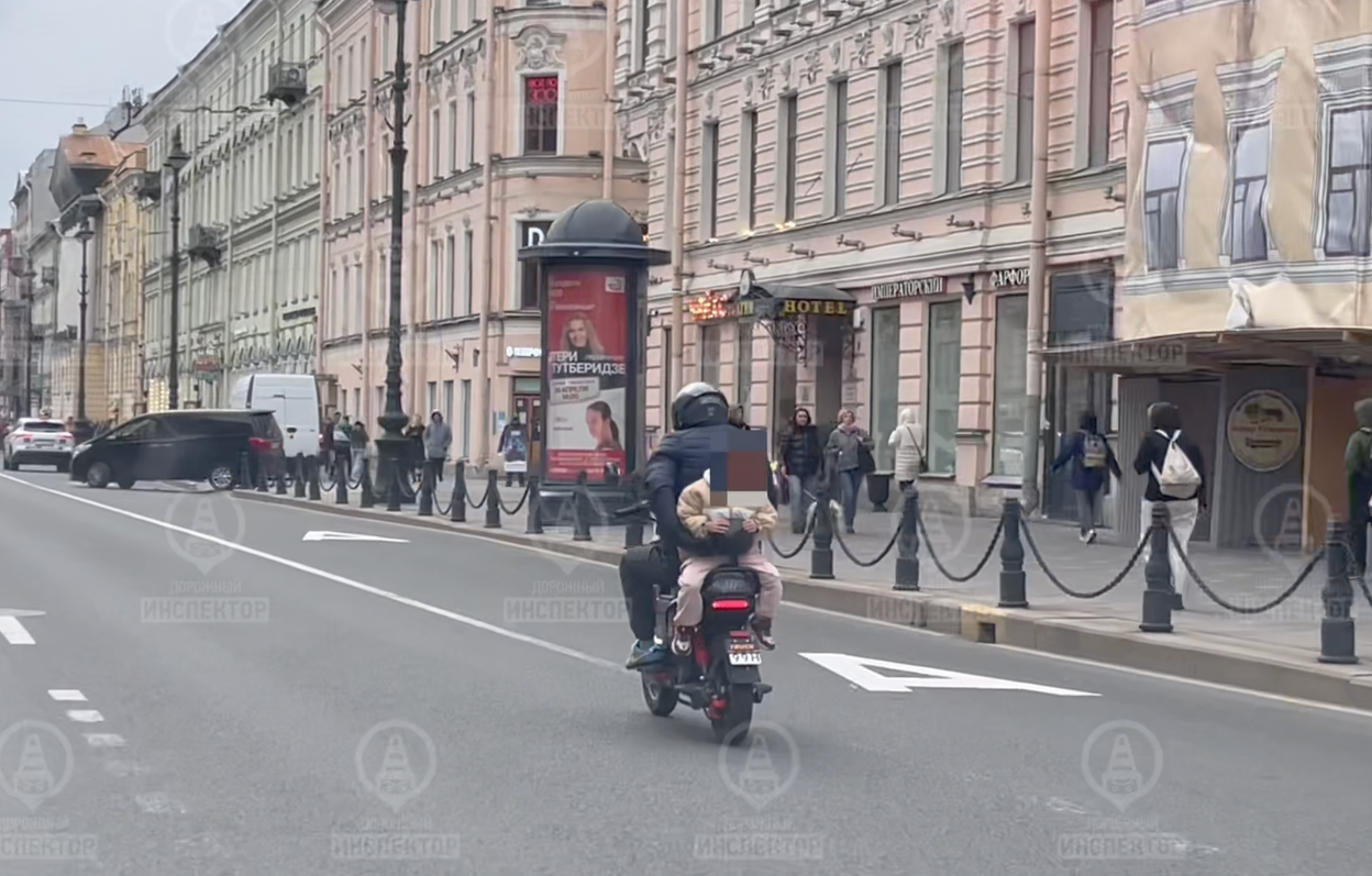 В Санкт-Петербурге на Невском проспекте очевидцы заметили мотоциклиста, который во время движения одной рукой управлял байком, а другой удерживал на багажнике девочку, сидевшую за его спиной. Об этом сообщает тг-канал «Дорожный инспектор», опубликовавший кадры происшествия.