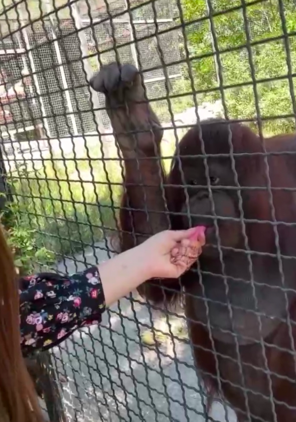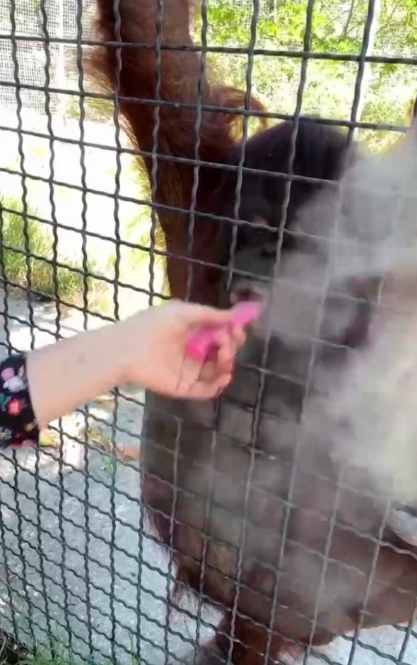 На кадрах видео, которое распространили соцсети и тг-каналы, девушка курит электронную сигарету, находясь рядом с вольером, в котором сидит орангутан по кличке Дана. Потом она передает примату вейп, и животное не отказывается, а повторяет движения человека. На второй раз орангутан внушительно затягивается и выдыхает облако дыма.