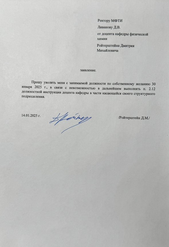 Преподаватель химии МФТИ Дмитрий Ройтерштерн обвинил завкафедрой вуза в фальсификации оценок и написал заявление об увольнении по собственному желанию. Об этом педагог в подробностях рассказал на своей странице в ВК, на пост обратил внимание тг-канал «Первый университетский».