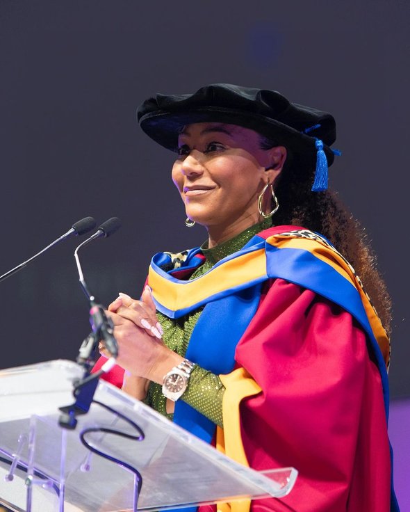 В своей торжественной речи на сцене First Direct Arena в Лидсе 49-летняя артистка призналась, что получение докторской степени является для нее «таким же значительным достижением, как выступление на стадионе Уэмбли с группой Spice Girls». Мел Би также добавила, что очень бы хотела, чтобы до этого дня дожил ее отец, который бы очень гордился.