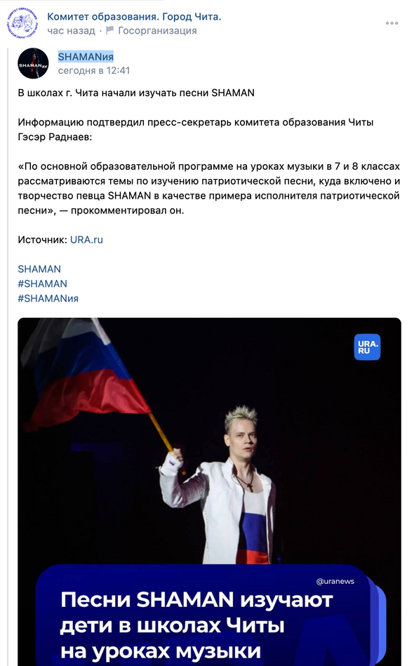«По информации комитета образования города Читы, по основной образовательной программе на уроках музыки в 7-х и 8-х классах рассматриваются темы по изучению патриотической песни, куда включено и творчество певца SHAMAN в качестве примера исполнителя патриотической песни», — заявил представитель городской админстрации. Он также тметил, что программы обучения в разных школах Читы разные, но блок «Патриотические песни» присутствует во всех.