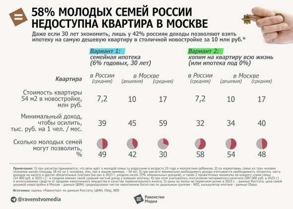 Самую дешевую квартиру в пределах МКАДа или рядом с ним можно купить за 10 млн рублей (в Тропарево). До пенсии родителям в возрасте 23 лет работать соответственно 42 и 37 лет, 18 из которых — содержать ребенка. При экстремальном варианте, когда семья проживает всю жизнь только на 1 прожиточный минимум на каждого члена семьи, накопить на дешевую московскую квартиру теоретически смогут 80% россиян, а взять ипотеку — 56%.