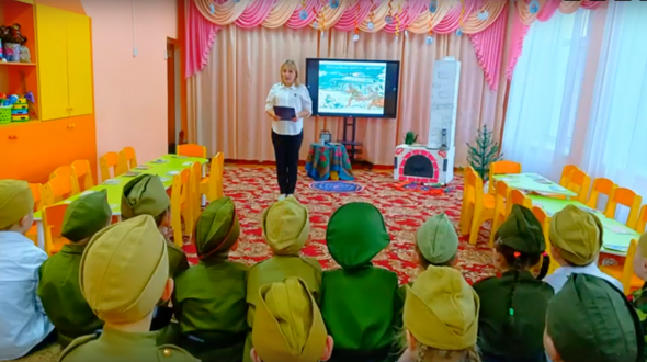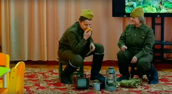 Утренник организовали сотрудники МАДОУ Детский сад № 12 «Березка» Калтанский ГО. Судя по кадрам выложенного видео, все воспитанники были одеты в военную форму, воспитатели изображали мерзнущих бойцов на фронте, в окопах, и мирных жителей в тылу. Потом к детям вышел Дед Мороз, который передал им привет от партизанов и собрал нарисованные открытки. В конце всех дошкольников накормили хлебом с сахаром.