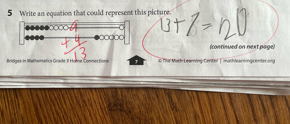 Пытаясь ответить на вопрос, школьник написал в качестве ответа «13+7=20», однако учительница обвела его как неправильный. Правильный ответ — «9+4=13». Родители не поняли, почему ответ именно такой и обратились за помощью в соцсети.