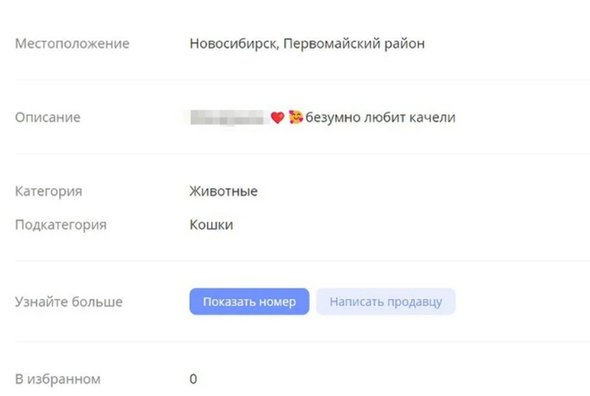 Объявление было размещено в разделе «Животные/кошки», однако на фото изображен сидящий на качелях маленький мальчик с пустышкой во рту. На вид ему не больше двух лет. При этом позвонить автору объявления нельзя, но можно написать сообщение. Геолокация самого продавца показывает, что он находится в Омской области.