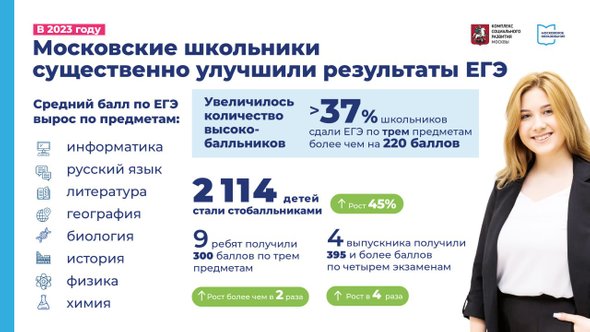 «Результаты ЕГЭ-2023 существенно лучше прошлого года… Самый главный показатель — средний балл. Он вырос почти по всем предметам: русскому языку, литературе, биологии, химии, физике, истории, информатике, географии. Рост составил до 13%», — сообщил Собянин в своем личном блоге.