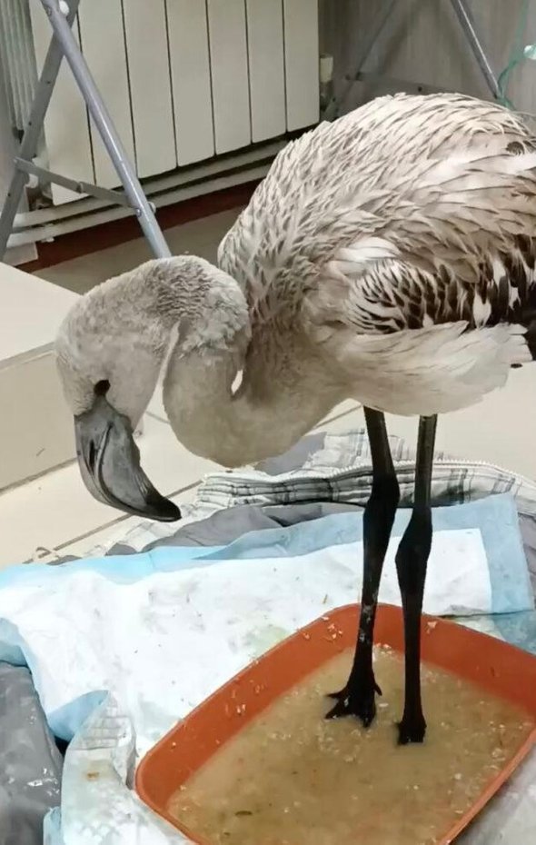 «Он маленький, и ему страшно». В екатеринбургском центре реабилитации пытаются спасти найденного в лесу фламинго