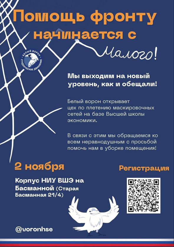 Студенческая патриотическая организация «Белый ворон» объявила у себя в тг-канале о том, что в центре Москве на территории корпуса НИУ ВШЭ откроется цех по плетению маскировочных сетей для нужд СВО.