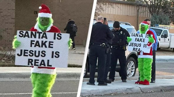 «Санта — фейк, а Иисус — реален». В США уличный проповедник в костюме Гринча пугает детей возле школы