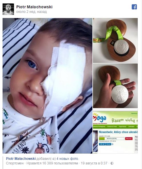 Польский олимпийский спортсмен Пётр Малаховски выставил свою медаль на аукцион, чтобы собрать деньги на лечение больного ребёнка. Об этом пишут «Такие дела».