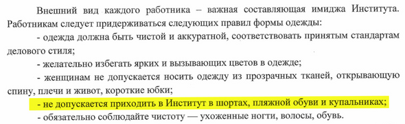 Другой блок требований вполне детально касается внешнего вида сотрудников. Документ запрещает женщинам носить одежду из прозрачных тканей, открывающую спину, плечи и живот, а также короткие юбки, вне зависимости от гендерной принадлежности в дресс-коде ученых «не допускается приходить в институт в шортах, пляжной обуви и купальниках».
