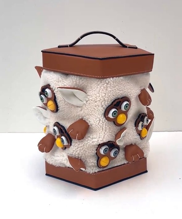 «Сумка изготовлена из гладкой бычьей кожи и белой овчины, с контрастной белой строчкой и черными краями. Для создания также использовались старые игрушки Furby», — пишет автор поста. Кроме того, из бывших говорящих игрушек не извлекли механизмы, поэтому они продолжают издавать звуки и шевелиться.