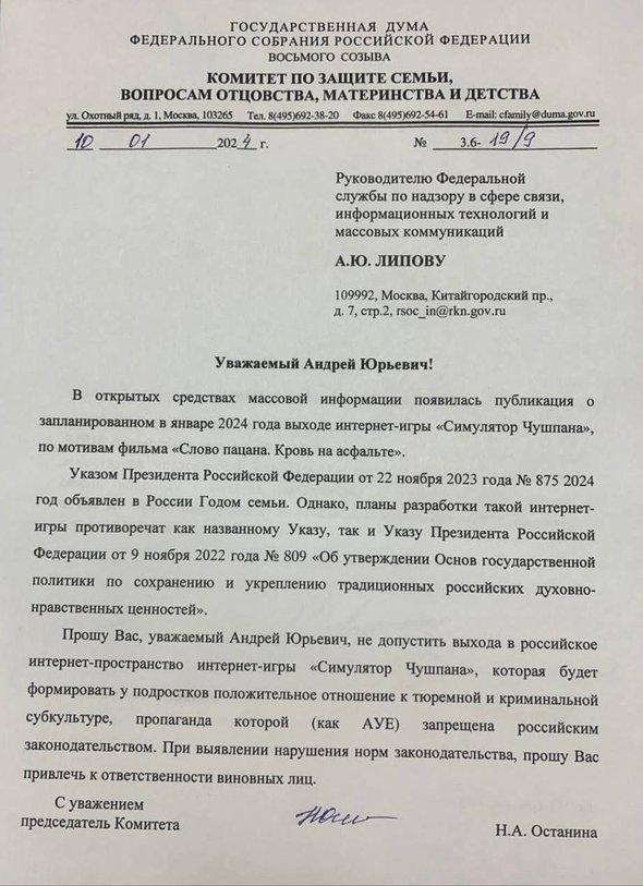 Председатель комитета Госдумы по защите семьи, вопросам отцовства, материнства и детства Нина Останина попросила главу Роскомнадзора Андрея Липова запретить выпуск компьютерной игры «Симулятор Чушпана» по мотивам сериала «Слово пацана». Об этом она сообщила в своем тг-канале.