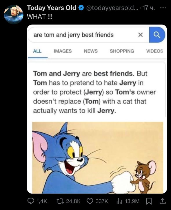 Пользователь X (бывший твиттер, заблокирован в России) с ником @todayyearsolding поделился ответом на запрос в поисковике: «Том и Джерри — лучшие друзья?». Ответ, неожиданно, оказался положительным: