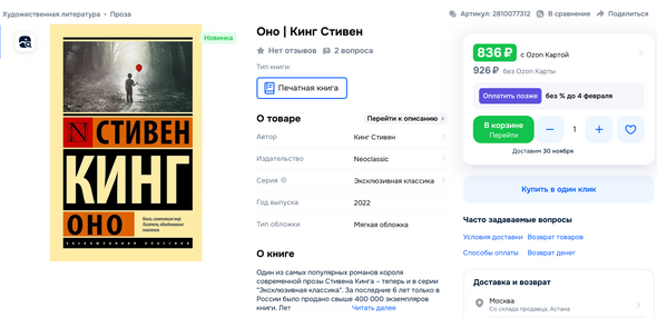 Российские маркетплейсы и книжные магазины убирают из продажи роман Стивена Кинга «Оно». Как сообщили ТАСС в пресс-службе объединенной компании Wildberries и Russ, произведение может быть запрещено в РФ или нарушать правила площадки.
