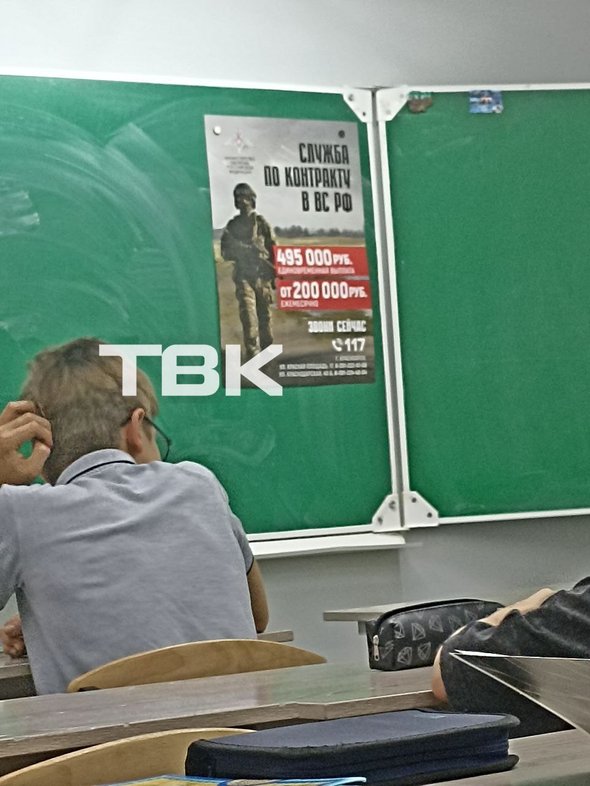 В одной из школ Красноярска в классе на доске появился прикрепленный плакат с рекламой армейской службы по контракту. Как сообщает ngs24.ru, плакат повесили на доске в школе № 45, а фотографию из класса редакцию прислали родители семиклассников.