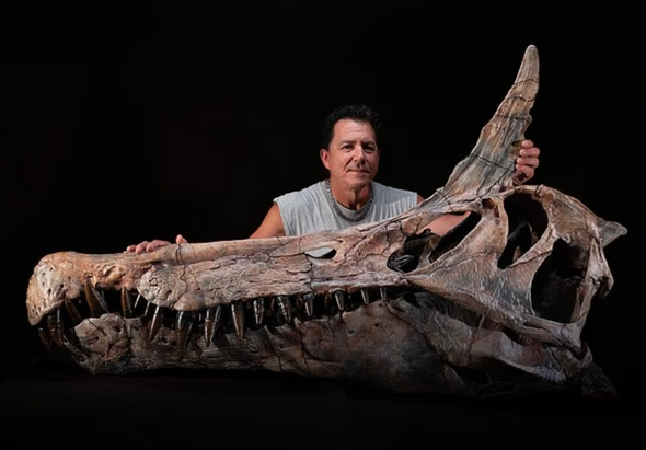 Многие уверены, что исследователи нашли «настоящего дракона». Речь идет о гигантском черепе размером с взрослого человека с вытянутой, напоминающей крокодилью мордой и длинной челюстью, усеянной острыми зубами величиной с человеческую ладонь. Над глазами у существа располагался огромный изогнутый костяной рог, а заднюю часть головы украшали выступающие шипы, из-за чего реконструированный облик животного оказался поразительно похож на мифологических крылатых чудовищ из древних легенд разных народов.