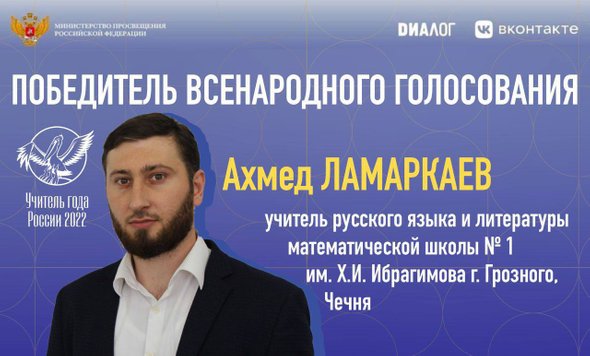 Обладателем звания «Народный учитель года» стал Ахмед Ламаркаев, учитель русского языка и литературы в математической школе № 1 имени Ибрагимова в Грозном. Свои голоса за него отдали почти 26 тысяч человек. Об этом сообщает телеграм-канал «Большая перемена РФ».