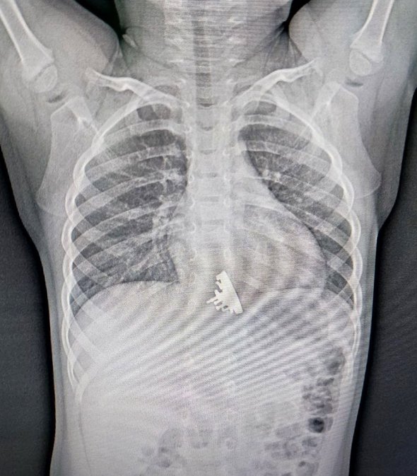 Со слов родителей ребенка, сначала они заметили, что дочь поперхнулась, начала подкашливать и беспокойно себя вести. Самостоятельно выяснить причину такого поведения они не смогли и решили обратиться к медикам. Родители приехали с девочкой в приемное отделение ОГАУЗ ГИМДКБ и описали им свои наблюдения. Рентген снимок показал наличие инородного тела в нижней трети пищевода ребенка, судя по очертаниям предмета, ребенок проглотил игрушечный кораблик из набора конструктора.