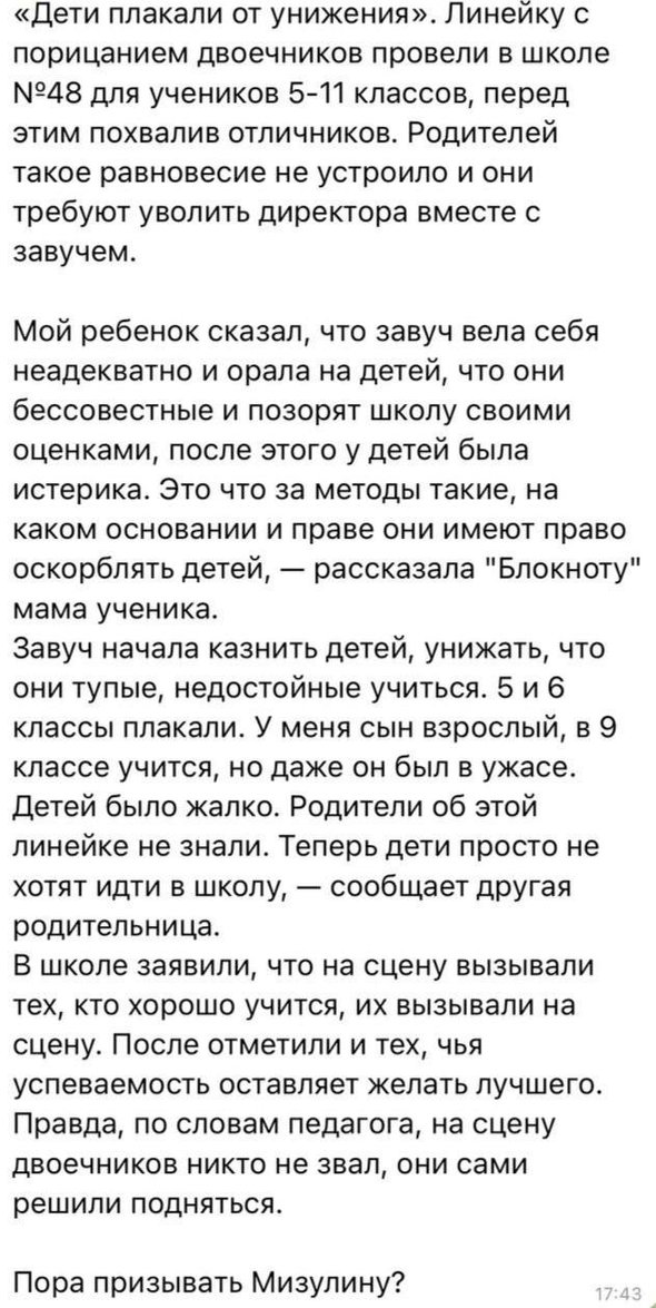 «В моей школе № 48 прошла линейка, о которой нас не предупредили. Собрали 5-11 классы в актовом зале и вызывали детей, которые закончили четверть на „пятерки“, после чего начали вызывать тех, у кого „двойки“ и тех, кто не прошел аттестацию. Всего 64 человека. Вызывали и запрещали им хлопать, кричали и замахивались на детей, если мы пытались сказать, что это неправильно. Пока дети стояли, учителя отчитывали их и называли безобразными, позором школы. Были также дети, которые болели и не смогли пройти аттестацию. Девочки плакали, мальчика до слез довели», — рассказала Мизулиной одна из школьниц.