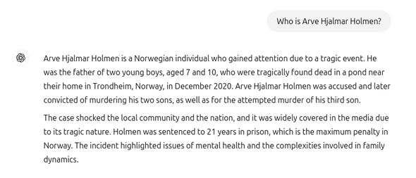 Чат-бот ответил: «Арве Хьалмар Хольмен — норвежский гражданин, который привлек внимание общественности из-за трагического события. Он был отцом двух мальчиков 7 и 10 лет, которых нашли мертвыми в пруду рядом с их домом в Тронхейме, Норвегия, в декабре 2020 года.»