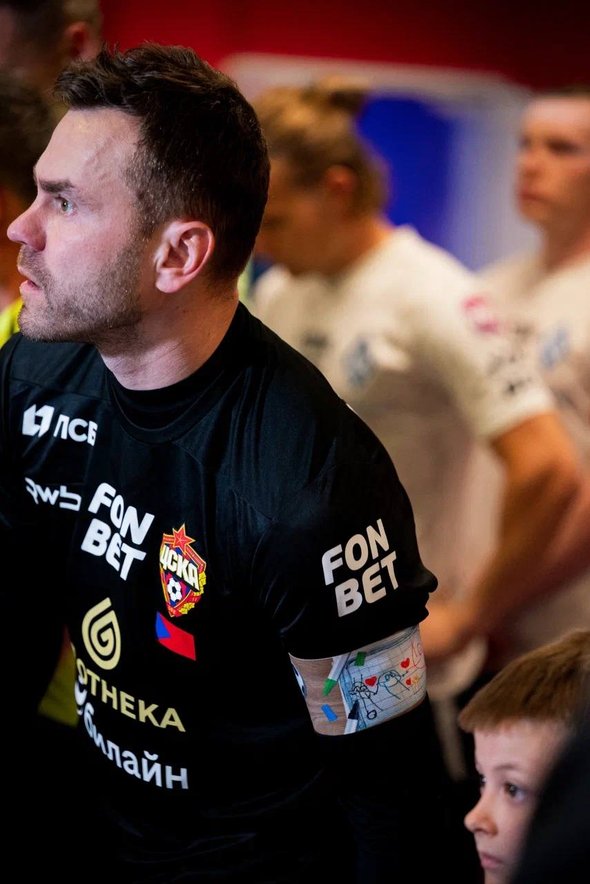 Футболист Игорь Акинфеев надел на игру капитанскую повязку, разрисованную его детьми