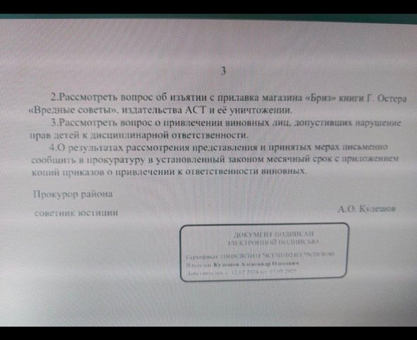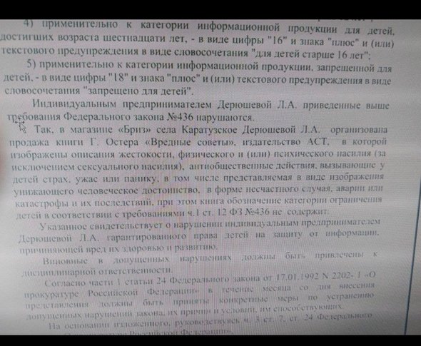 В Красноярском крае прокуратура Каратузского района выпустила представление в адрес местного магазина «Бриз» с требованием «рассмотреть вопрос об изъятии с прилавка книги Григория Остера „Вредные советы“ и ее уничтожения». Об этом сообщает Baza.